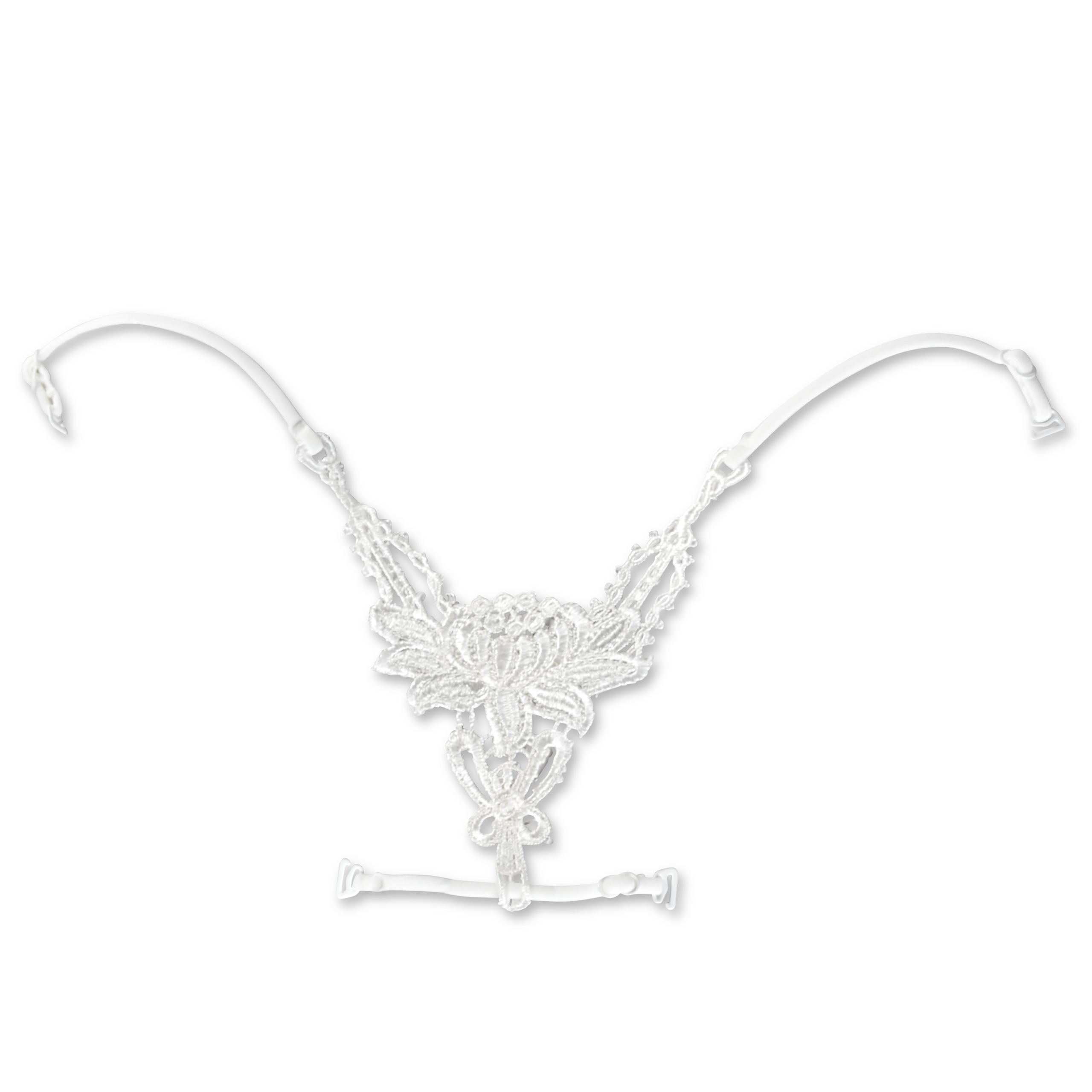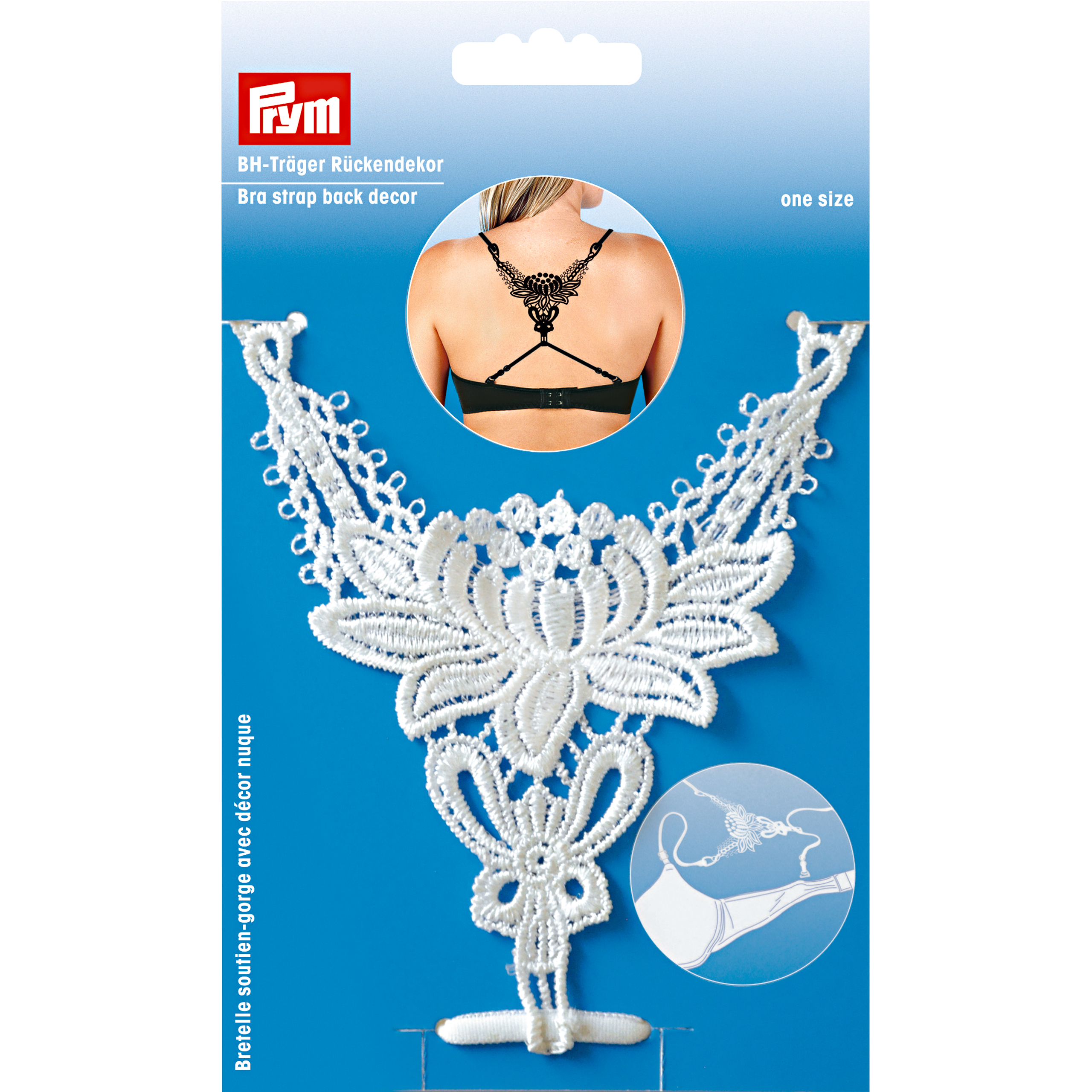 Das Rückendekor mit floralem Muster, aus schwarzer oder weißer Spitze, schmückt den Rücken zwischen den Schultern beim Tragen von rückenfreien Tops oder Kleidern. Es verfügt über zwei Schulterträger sowie zwei Rückenträger und kann dadurch anstelle der vorhandenen Träger am BH befestigt werden. Alle vier Träger sind verstellbar und mit einem farblich passenden Kunststoffhaken ausgestattet. Das Dekor mit Trägern ist zu je