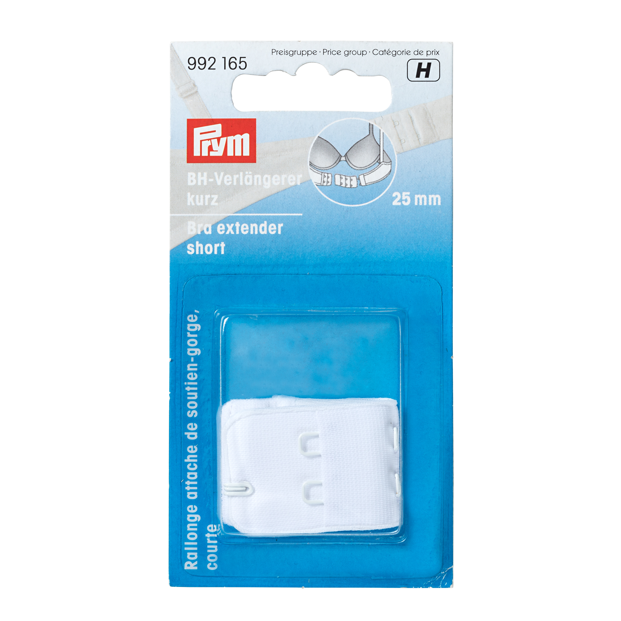 Zur geringen Erweiterung des Unterbrustumfangs bei BHs eignen sich die BH‑Verlängerer mit drei Verstellmöglichkeiten aus Polyamid, Elasthan und Polypropylen. Sie können einfach zwischen den beiden Enden des BHs eingehakt werden. Durch die nahtfreie Verarbeitung lassen sich zu eng gewordene Lieblings‑BHs sehr bequem wieder tragen. Im Prym‑Sortiment sind die kurzen BH‑Verlängerer in Weiß in 3 verschiedenen Breiten zwischen 25 mm und 50 mm mit 2 Hakenösen pro Reihe erhältlich. Sie sind auf Hautverträglichkeit geprüft und waschbeständig bis 40 Grad.