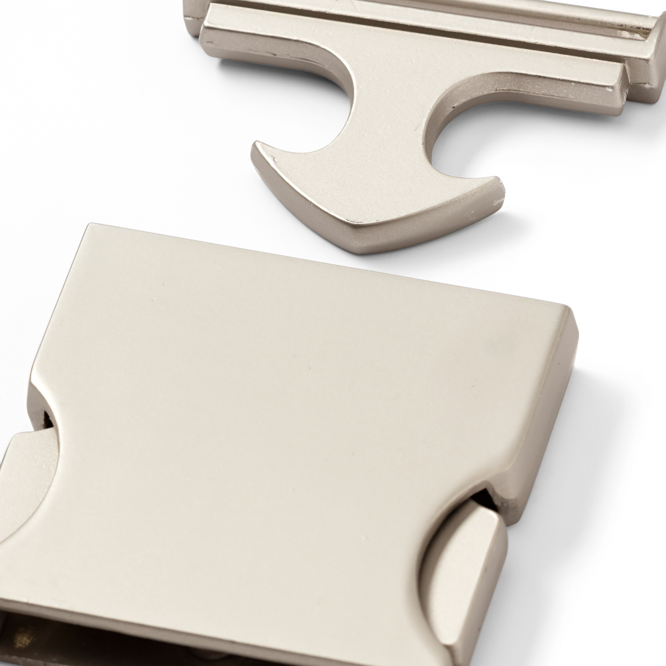 Diese rechteckige Gürtelschnalle beeindruckt durch ihr schlichtes, schönes Design und ist optimal für selbst gemachte Gürtel aus Stoff, Leder oder Gurtbändern geeignet. Sie setzt sich durch ihr fein gebürstetes, silberfarbiges Metall gut in Szene und besteht aus zwei Teilen. Der Steckverschluss rastet durch seine Pfeilform perfekt in die Steckplatte ein – zwei kreisförmige Aussparungen auf der Steckplatte dienen dabei dem komfortablen Öffnen und Schließen. Mit 7 mm Höhe ist sie dabei so flach verarbeitet, dass sie kaum aufträgt. Annähen lässt sich die Schnalle über zwei Annähaussparungen für die Gürtelschlaufen. Sie ist hochwertig in der Ausführung – so schließt die Schnalle auch bei langer Anwendung stets zuverlässig. In Kombination mit den farbigen Elastics und Gurtbändern lassen sich hier originelle Gürtel realisieren.
