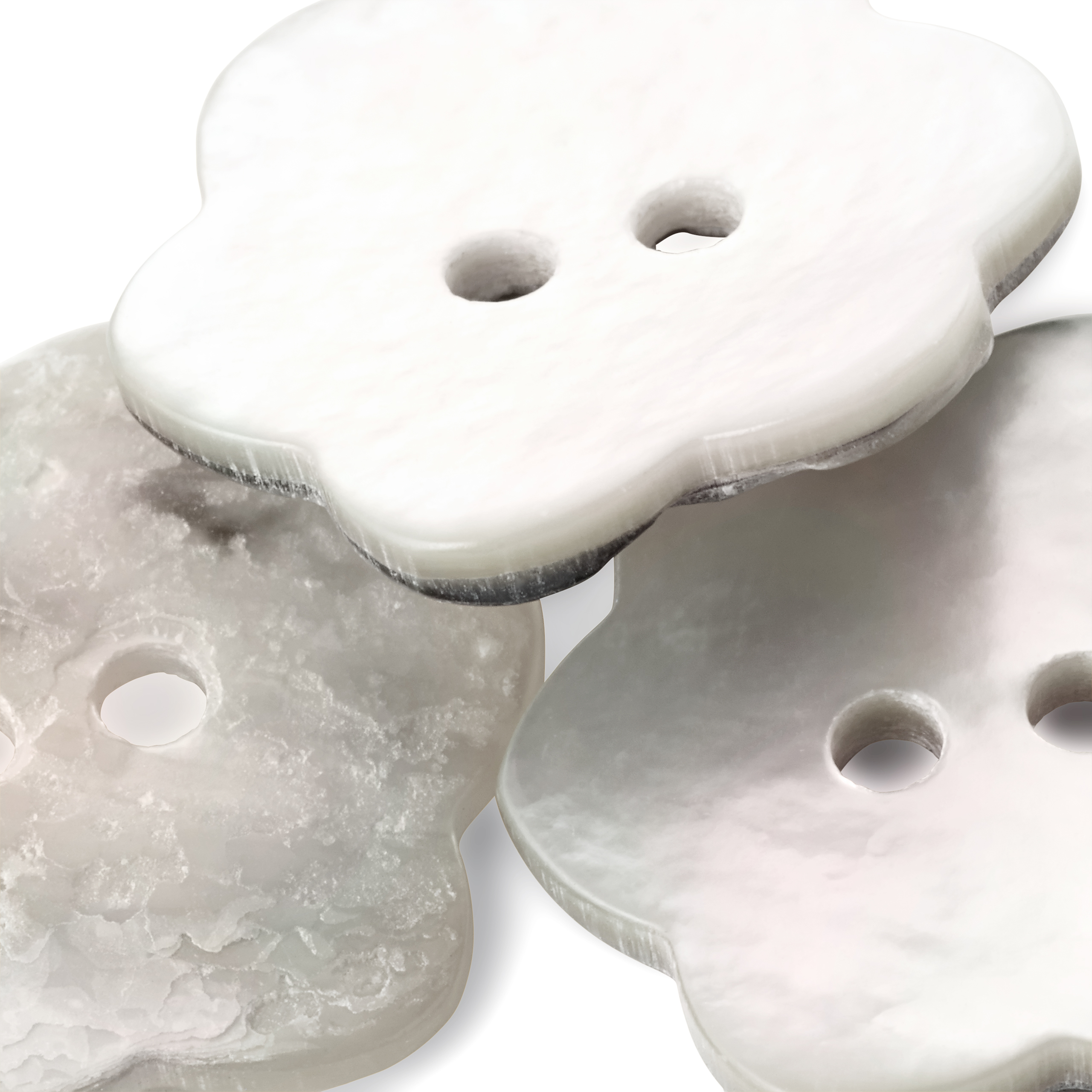 Bei den Knöpfen „Perlmutt Blume“ handelt es sich um echte Unikate aus dem Naturmaterial Perlmutt. In den Größen 15 mm, 18 mm und 20 mm schmücken sie Blusen, Blazer und Jacken mit ihrer Form einer 6-blättrigen Blume. Die Knöpfe sind mit zwei Annählöchern bestückt und damit perfekt für feine und leichte Damenoberbekleidung geeignet. Die schillernden Perlmuttknöpfe sind bis 30 Grad waschbar und reinigungsbeständig. Je nach Knopfgröße sind drei oder vier Knöpfe auf der SB-Karte angebracht.