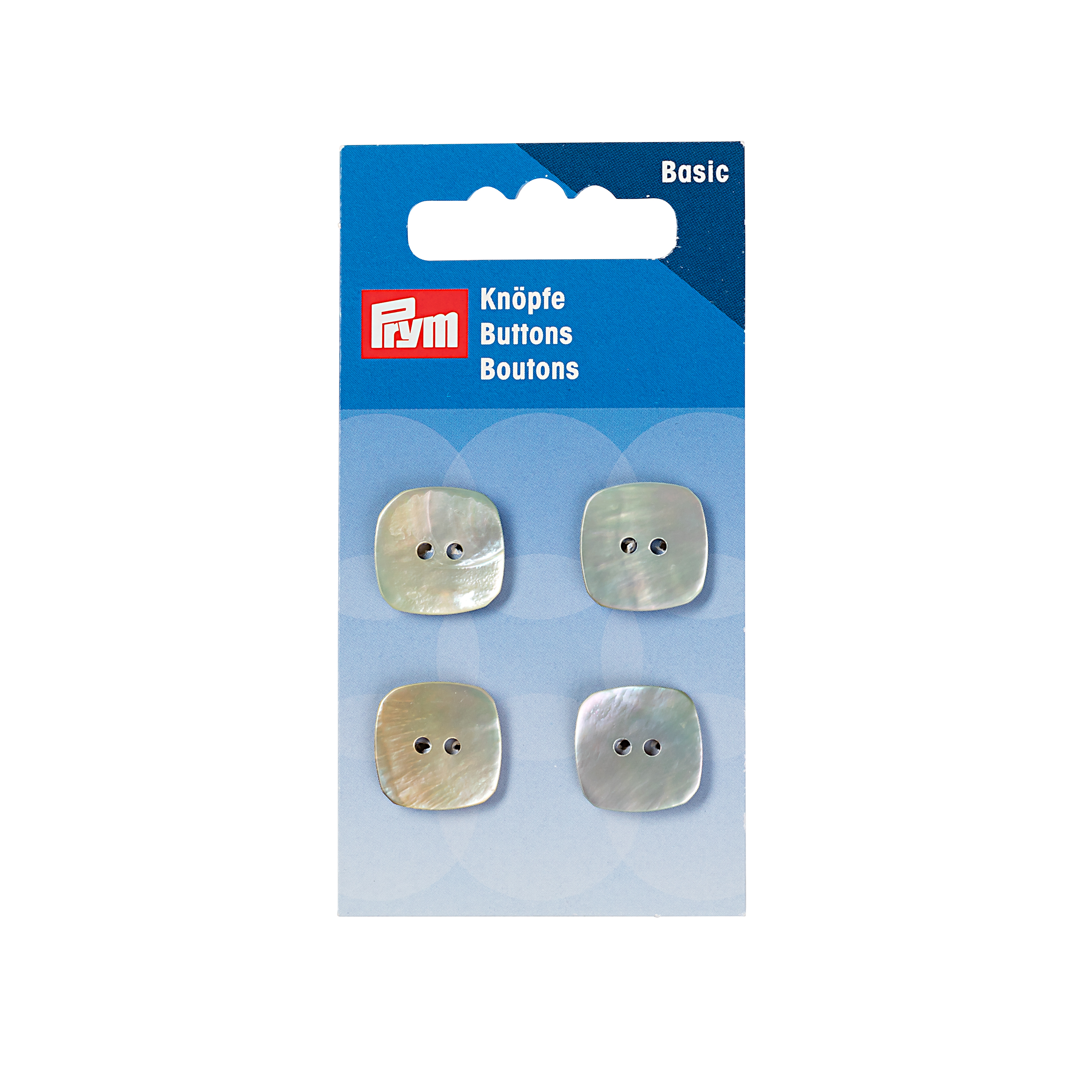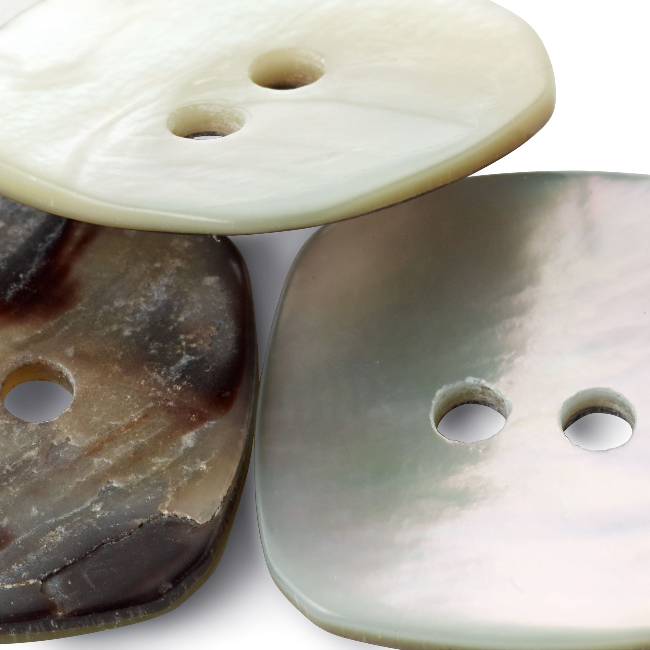 Bei den Knöpfen „Perlmutt Vierecke“ handelt es sich um echte Unikate aus dem Naturmaterial Perlmutt. In den Größen 13 mm, 15 mm und 18 mm schmücken sie Blusen, Blazer und Jacken mit ihrer abgerundeten quadratischen Form. Die Knöpfe sind mit zwei Annählöchern versehen und damit optimal für feine und leichte Damenoberbekleidung geeignet. Die schillernden Perlmuttknöpfe sind bis 30 Grad waschbar und reinigungsbeständig. Je nach Knopfgröße sind vier oder fünf Knöpfe auf der SB-Karte angebracht.