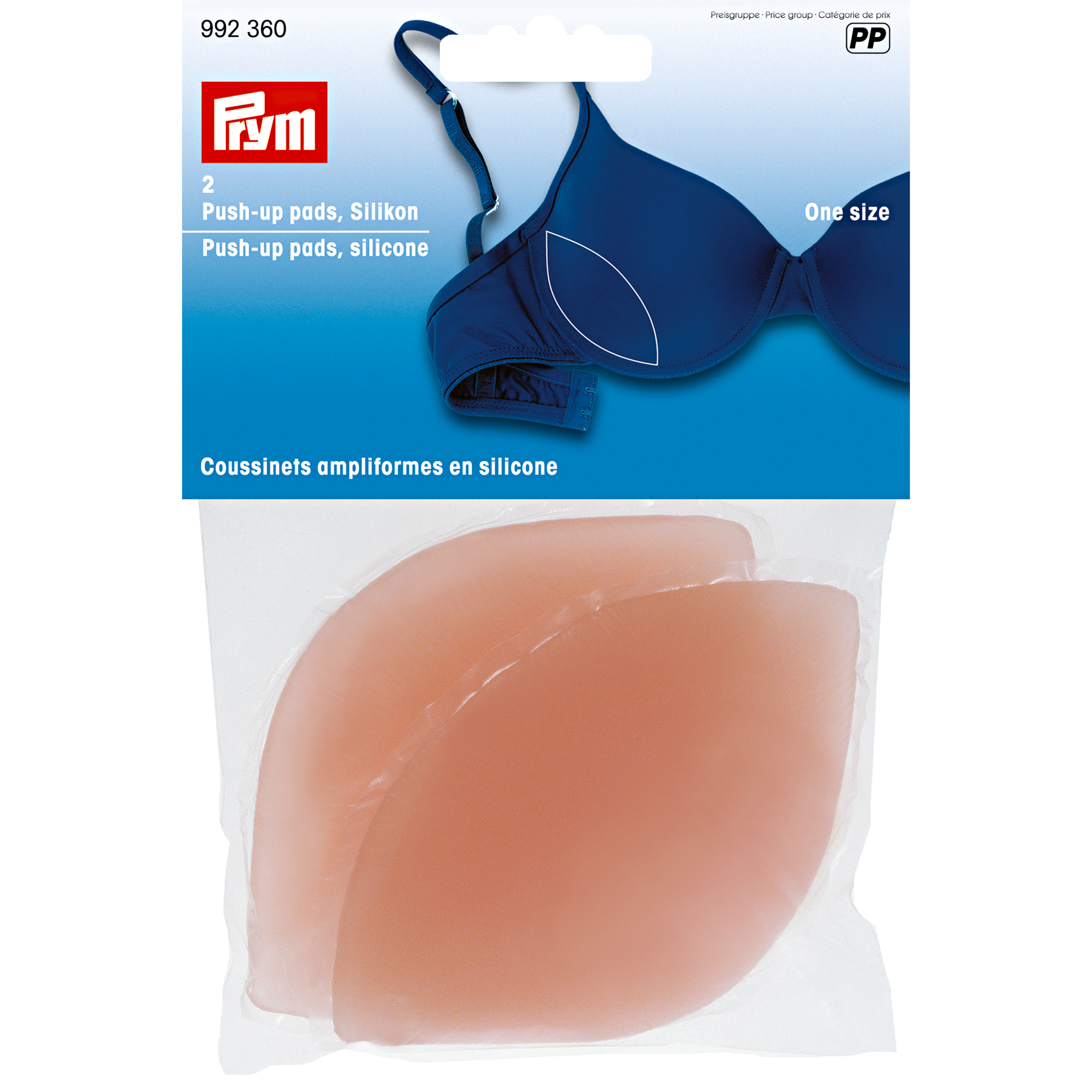 Zum Formen eines attraktiven Dekolletés gibt es die Push‑up Pads aus Silikon. Ohne weitere Befestigung können die Pads seitlich oder unten in das Körbchen eingelegt und direkt auf der Haut getragen werden. Sie verleihen der Brust eine optimale Form sowie deutlich mehr Volumen. Das weiche Material fühlt sich beim Tragen komfortabel und angenehm an. Oft sind an BHs bereits Taschen für die Pads eingenäht. Das Prym‑Sortiment führt die Push‑up Pads in Einheitsgröße zu je 1 Paar auf eine SB-Karte. Die Einlagen sind für die Handwäsche geeignet.